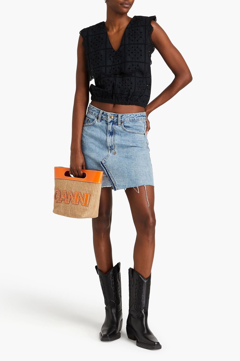 GANNI بلوزة مصنوعة من القطن بتطريز إنجليزي وحواف متموّجة