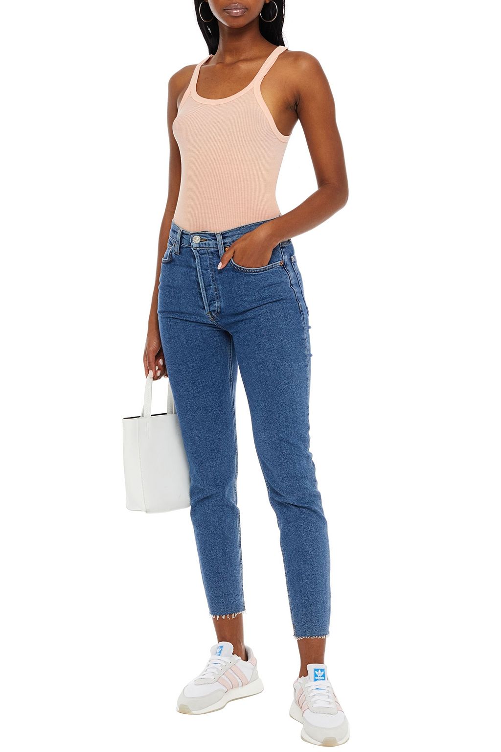 RE/DONE بنطلون جينز بقصة أرجل ضيقة وخصر مرتفع بحواف منسّلة بنمط فترة التسعينات