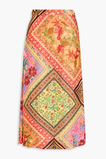تنورة متوسطة الطول من قماش كريب دي شين بتصميم ملتف ومزينة بطبعات على شكل زهور بشرّابات