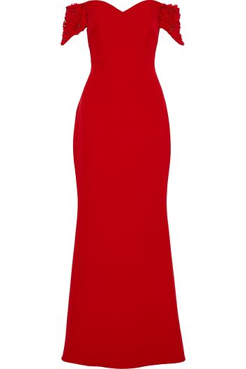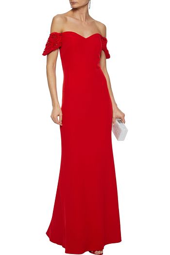 فستان سهرة مكشوف الكتفين من الكريب المرن المزين