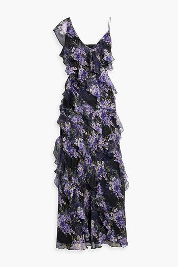 فستان طويل من قماش كريب دي شين الحريري مزين بكسرات وبطبعات على شكل زهور