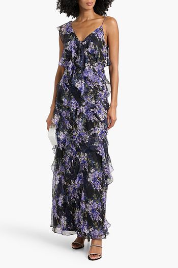 فستان طويل من مزيج الكتّان بطبقات متدرجة ومزين بطبعة الأزهار