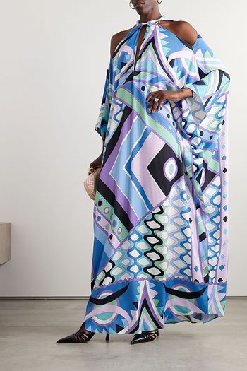 فستان طويل من الحرير الصيني بتصميم ملتف بطبعات