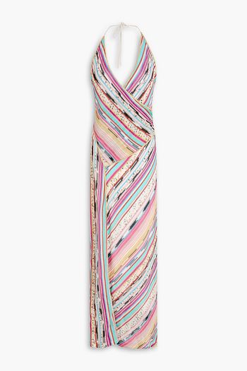 فستان طويل "جوليا" بحمالة عنق من الكريب دي شين مكشوفة الظهر ومخططة