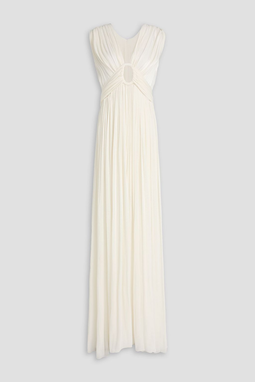 COSTARELLOS فستان سهرة من الجورجيت بكسرات وبفتحات ولون معدني