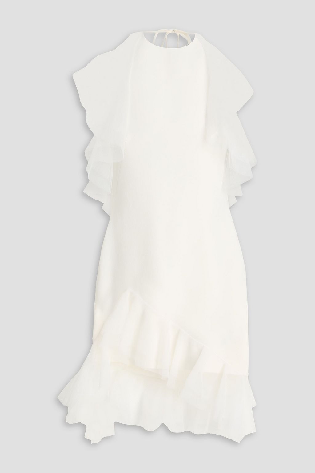 DAVID KOMA فستان قصير بياقة هالتر الدائرية من الكريب مزخرف بالتول بكشاكش
