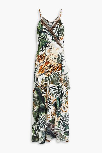 فستان طويل من الساتان بطبعات بقصّة غير متماثلة