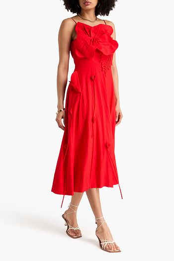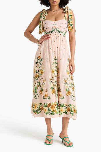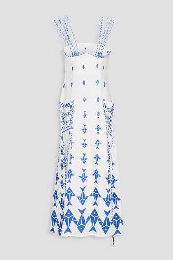 فستان متوسط الطول من مزيج الكتان بطبعة الأزهار بفتحات