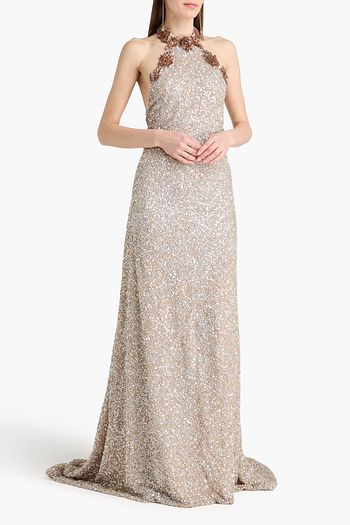 بلوزة "بيردي" بدون حمالات من التول مُزيّنة بزخارف الأزهار وبأقراص برّاقة