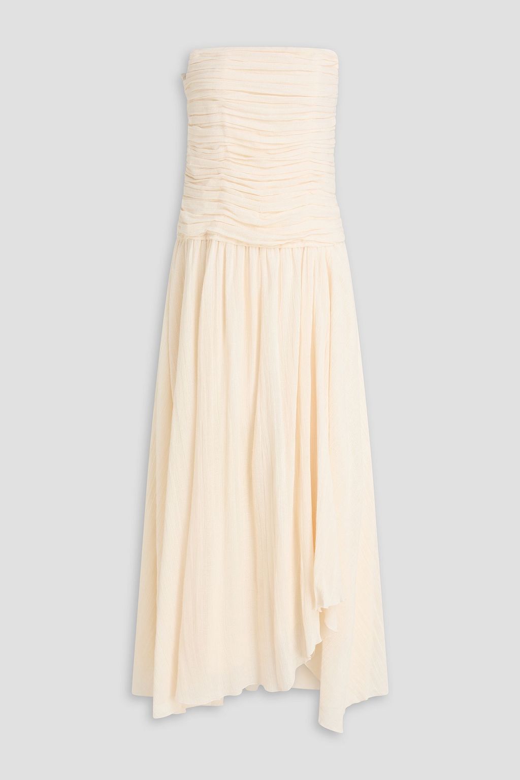 STAUD فستان ميدي "هاي تايد" مكشكش بدون حمالات من مزيج شاش القطن والرامي