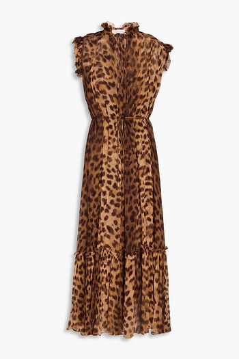فستان طويل من الشيفون الحريري بطبعة الأزهار وبتصميم بطبقات متدرجة