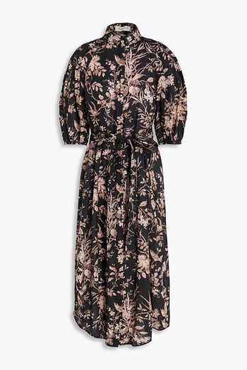 فستان متوسط الطول Zinnia من مزيج الحرير والقطن مزين بطبعة الأزهار ومزود بحزام