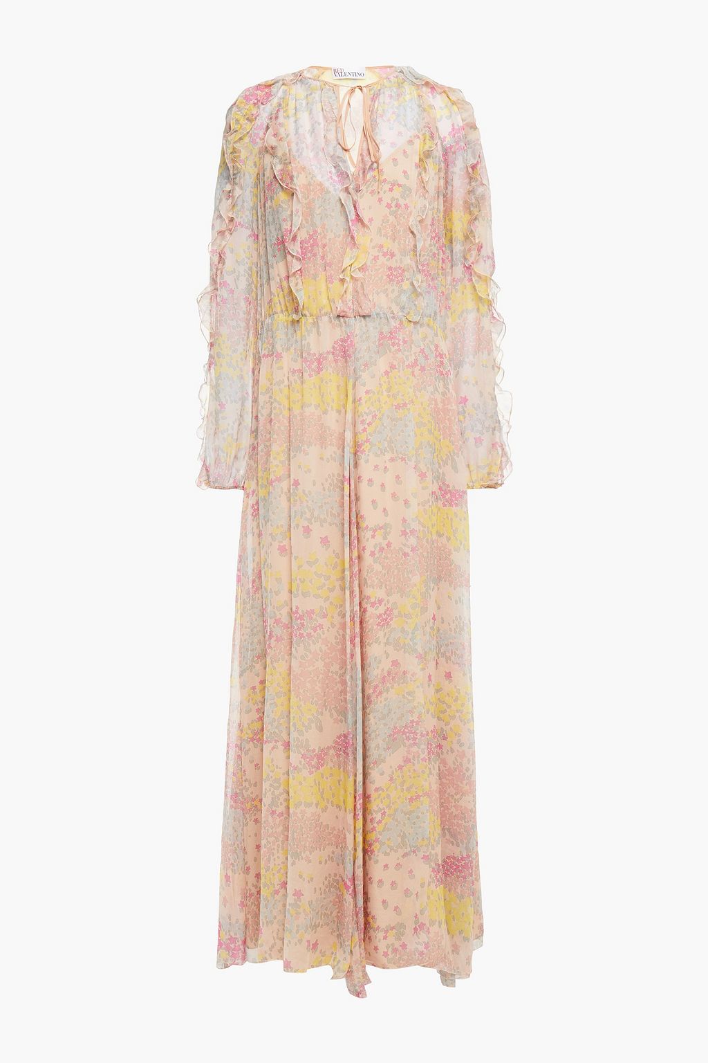 REDVALENTINO فستان طويل من الشيفون الحريري بتصميم مكشكش ومزين بطبعات