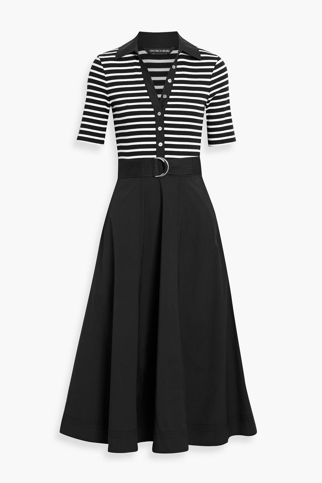 VERONICA BEARD فستان بأسلوب القميص "ديلسي" متوسط الطول من البوبلين المصنوع من مزيج القطن وقطع من الجيرسي بتصميم مخطط ومزين بحزام
