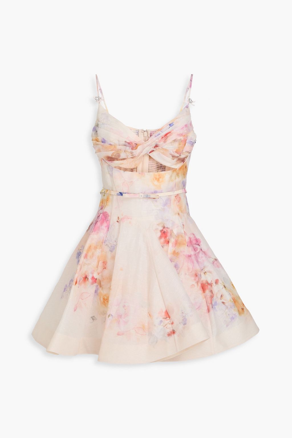 ZIMMERMANN فستان قصير مصنوع من مزيج الحرير والكتان مزود بحزام ومزين بطبعة الأزهار