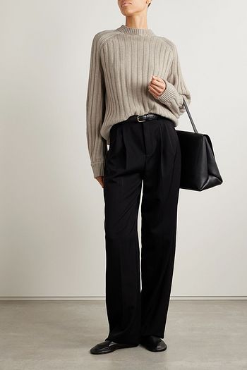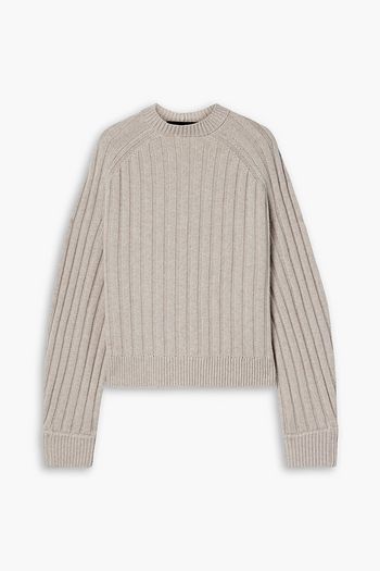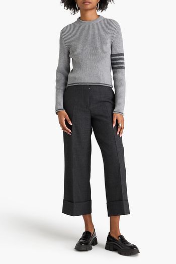 Chain-embellished leather-trimmed ribbed-knit sweater