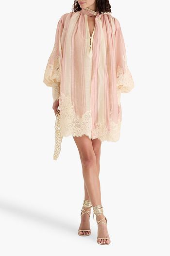 فستان قصير من الدانتيل المفرّغ بربطة من الأمام ومزين بأجزاء مقصوصة