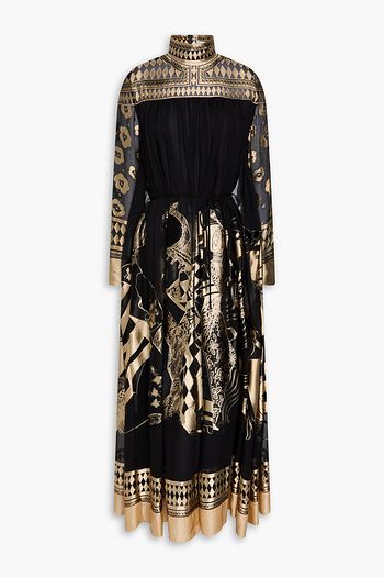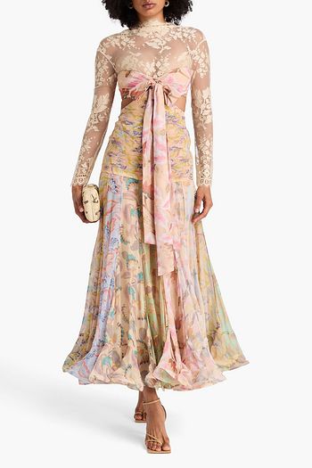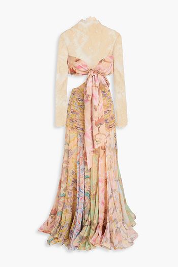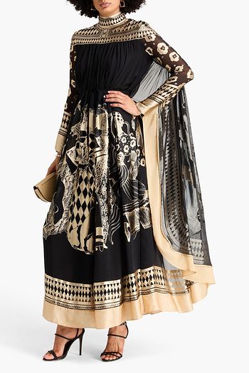 فستان طويل من الشيفون مخيط بأسلوب فيل كوبيه ومطبّع برسومات بالورود بكسرات