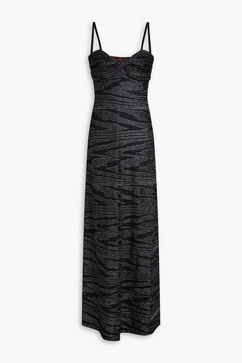 فستان طويل بِكُم واحد من المخمل المُجعّد مزين بطبعات وبفتحات