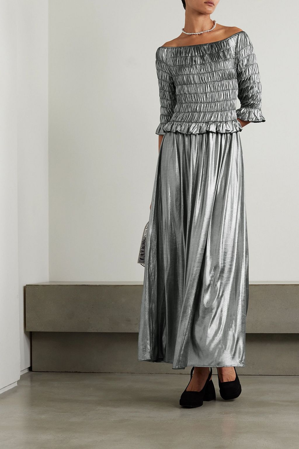 تألّقي بإطلالة فائقة الجمال في مناسبتكِ القادمة مع فستان 'Oak' من Batsheva. فهو مصنوع من اللاميه اللامع الذي يتميز بلمسة من المطاط - مما يجعل منه خياراً مثالياً للرقص طوال الليل. ويتّسم بصدر مُصمَّم بتقنية السموك ليتيح لك ارتداءه بأكتاف عالية أو متدلية، حسب إكسسواراتك.