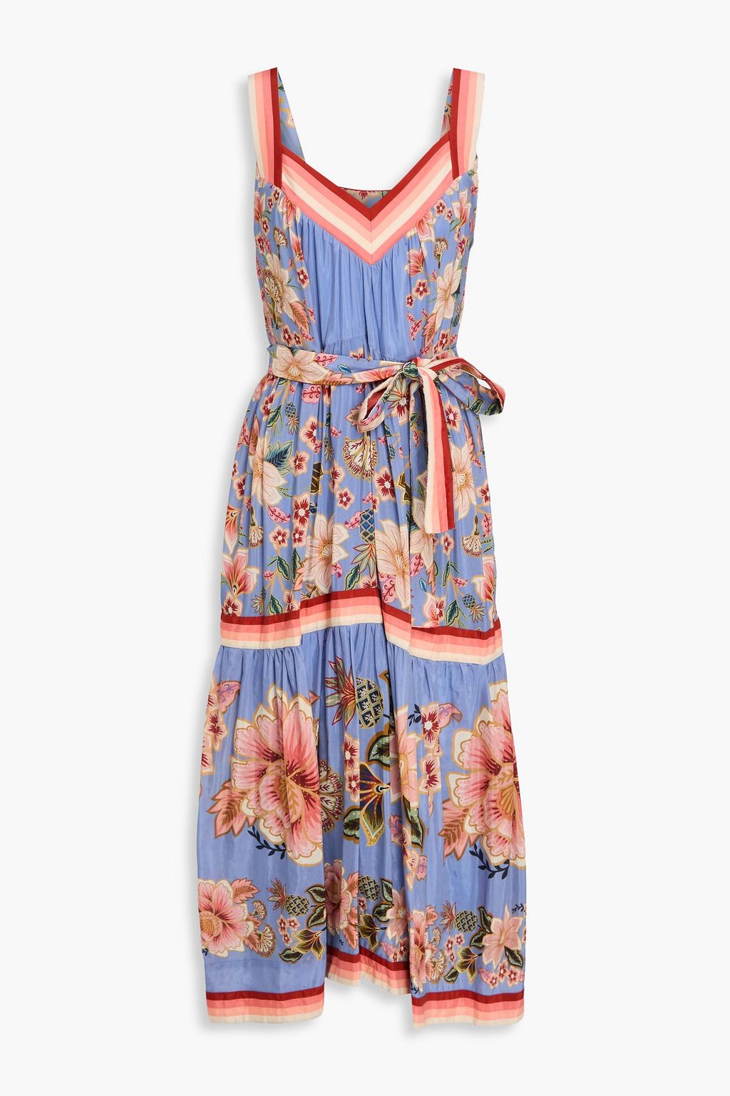FARM RIO فستان متوسط الطول من الحرير الصيني المصنوع من مزيج القطن مزين بطبعة الأزهار ومزوّد بحزام