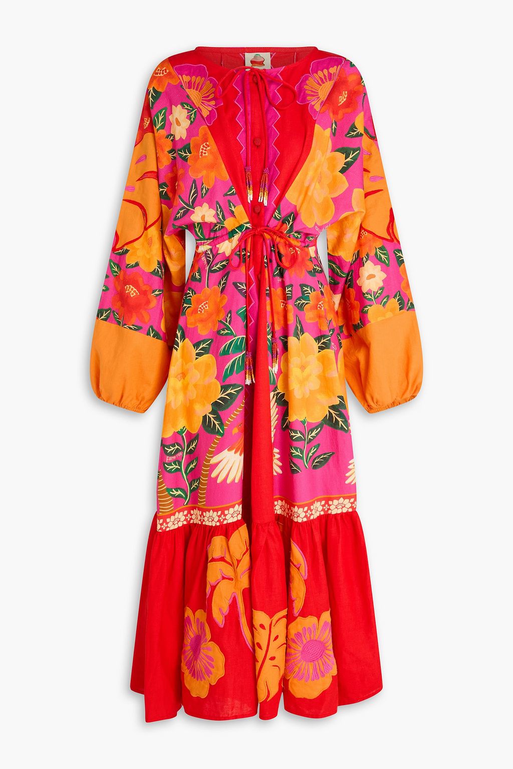 FARM RIO فستان متوسط الطول من مزيج الكتان مزيّن بالخرز بطبعات