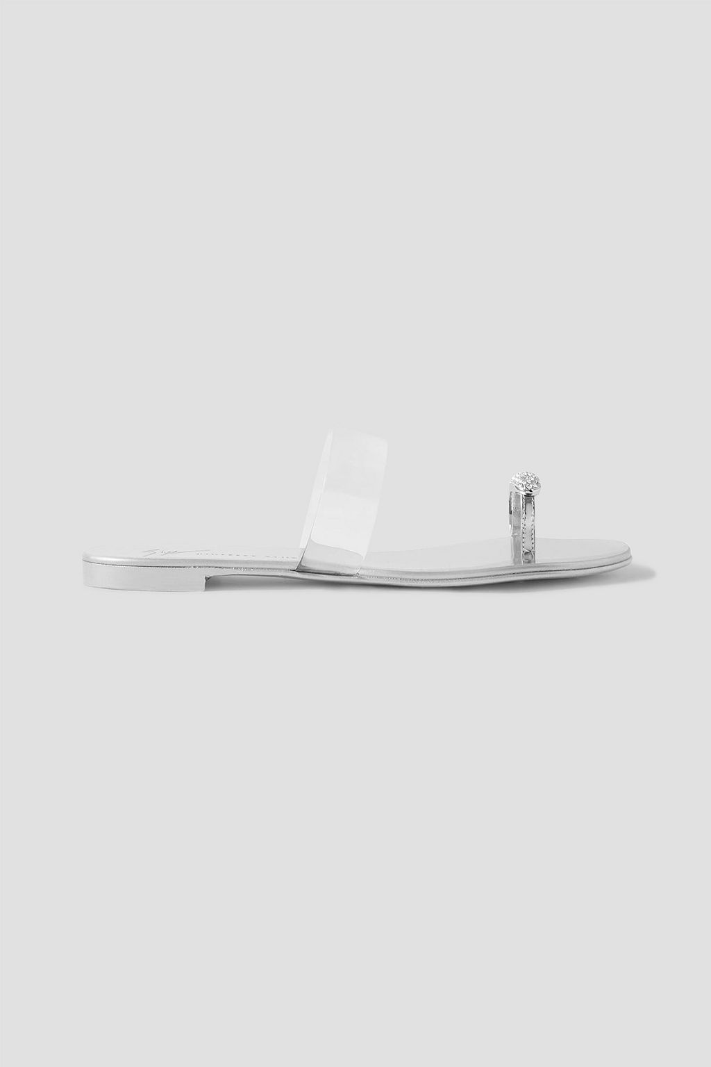 GIUSEPPE ZANOTTI صندل من البلاستيك الشفاف والجلد اللامع المعدني مزين بالكريستال