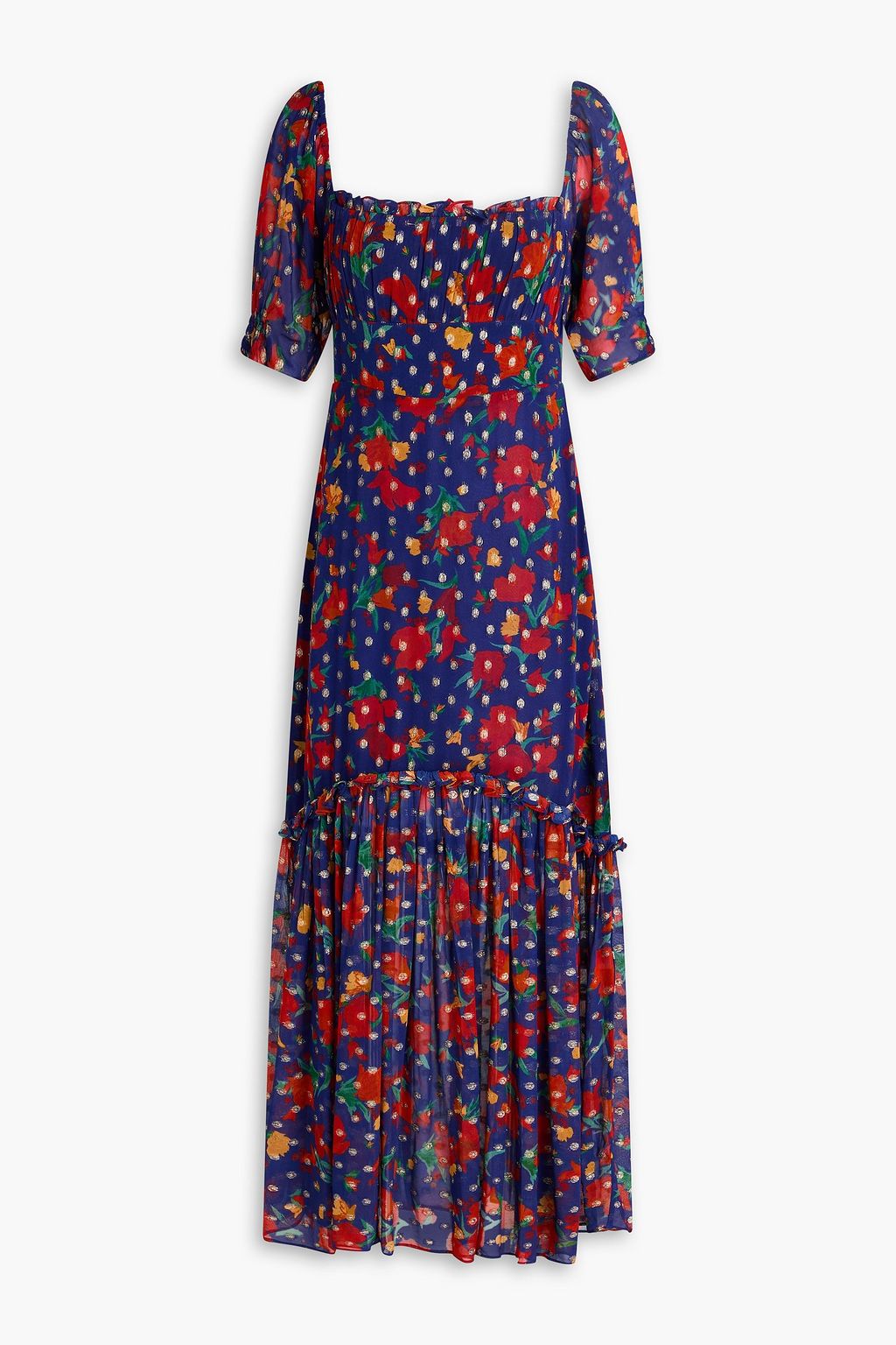 RIXO Floral-print metallic fil coupé midi dress