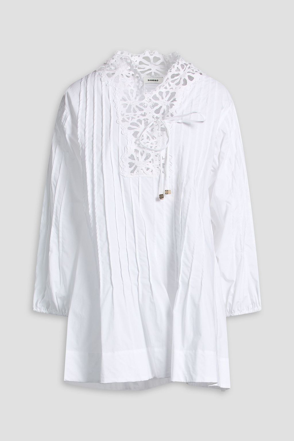 SANDRO فستان قصير من قطن بوبلين مزين بكسرات رفيعة وبحواف من الدانتيل