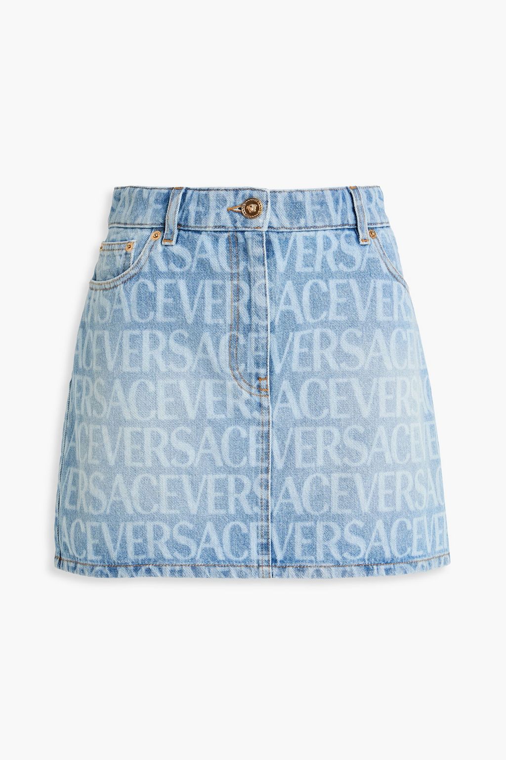 VERSACE تنورة قصيرة من الدنيم بطبعة شعار العلامة