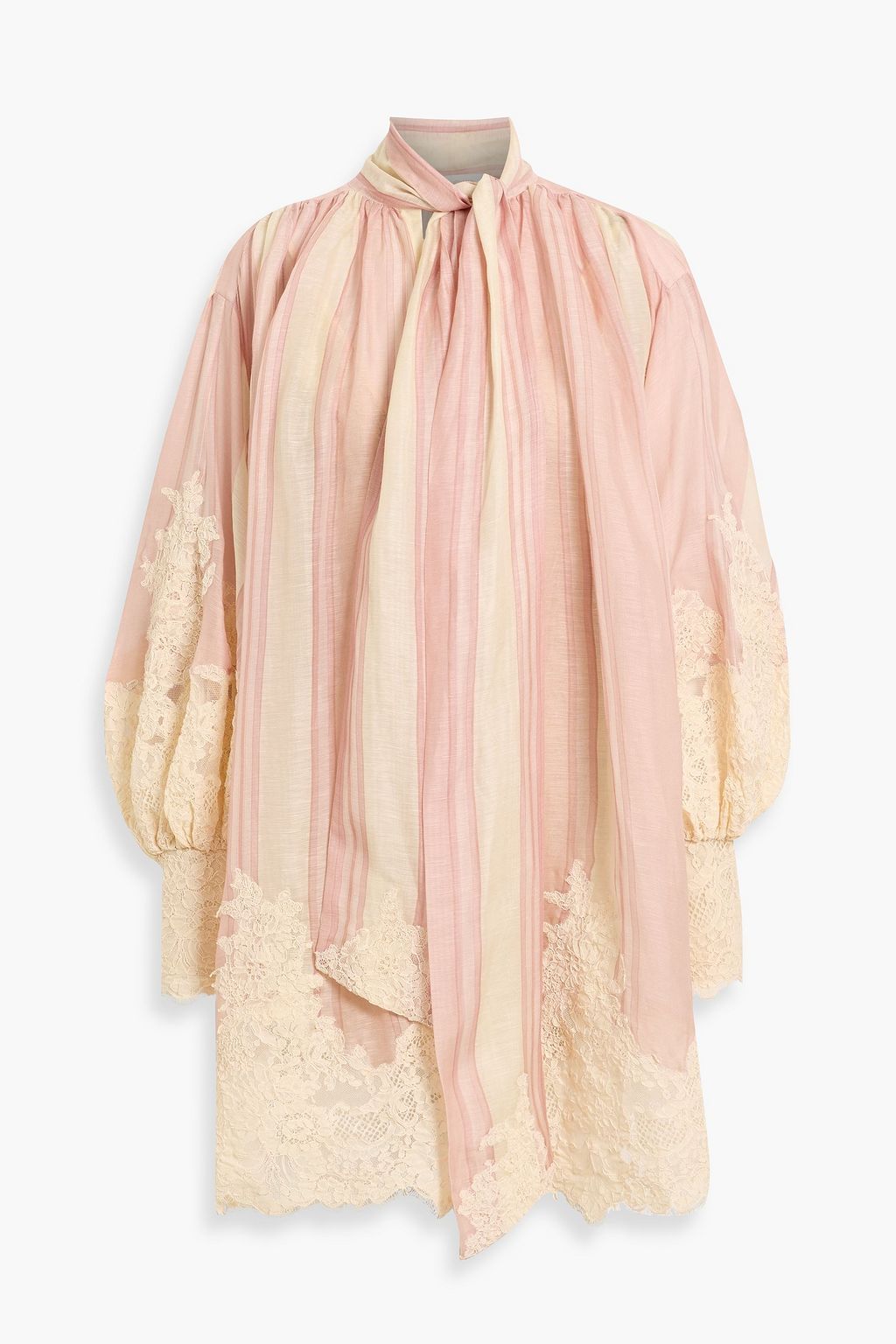 ZIMMERMANN فستان قصير مخطط من قماش رقيق من مزيج حرير والكتّان وبأجزاء من الدانتيل