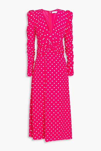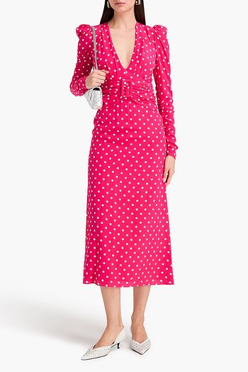فستان متوسط الطول من قماش كريب دي شين الحريري المطبّع بالورود مزيّن بعقدة فراشية بتأثير مزموم