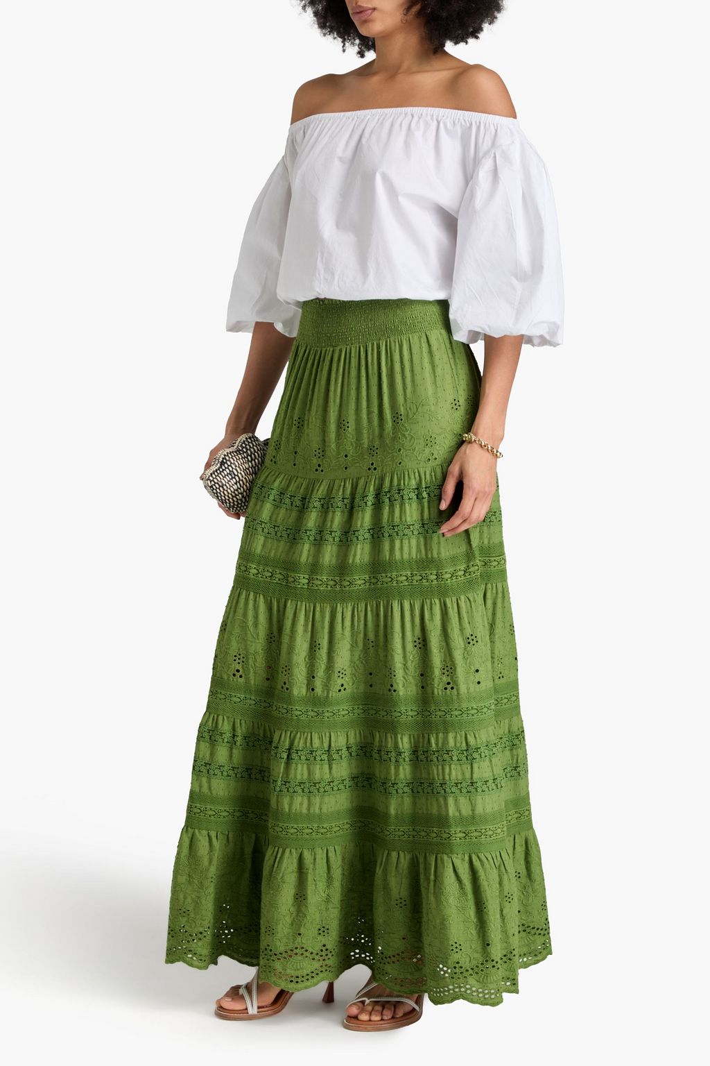 ALICE + OLIVIA تنورة طويلة "عائشة" من القطن بطبقات متدرجة منقطة بنمط سويسري وبتطريز إنجليزي