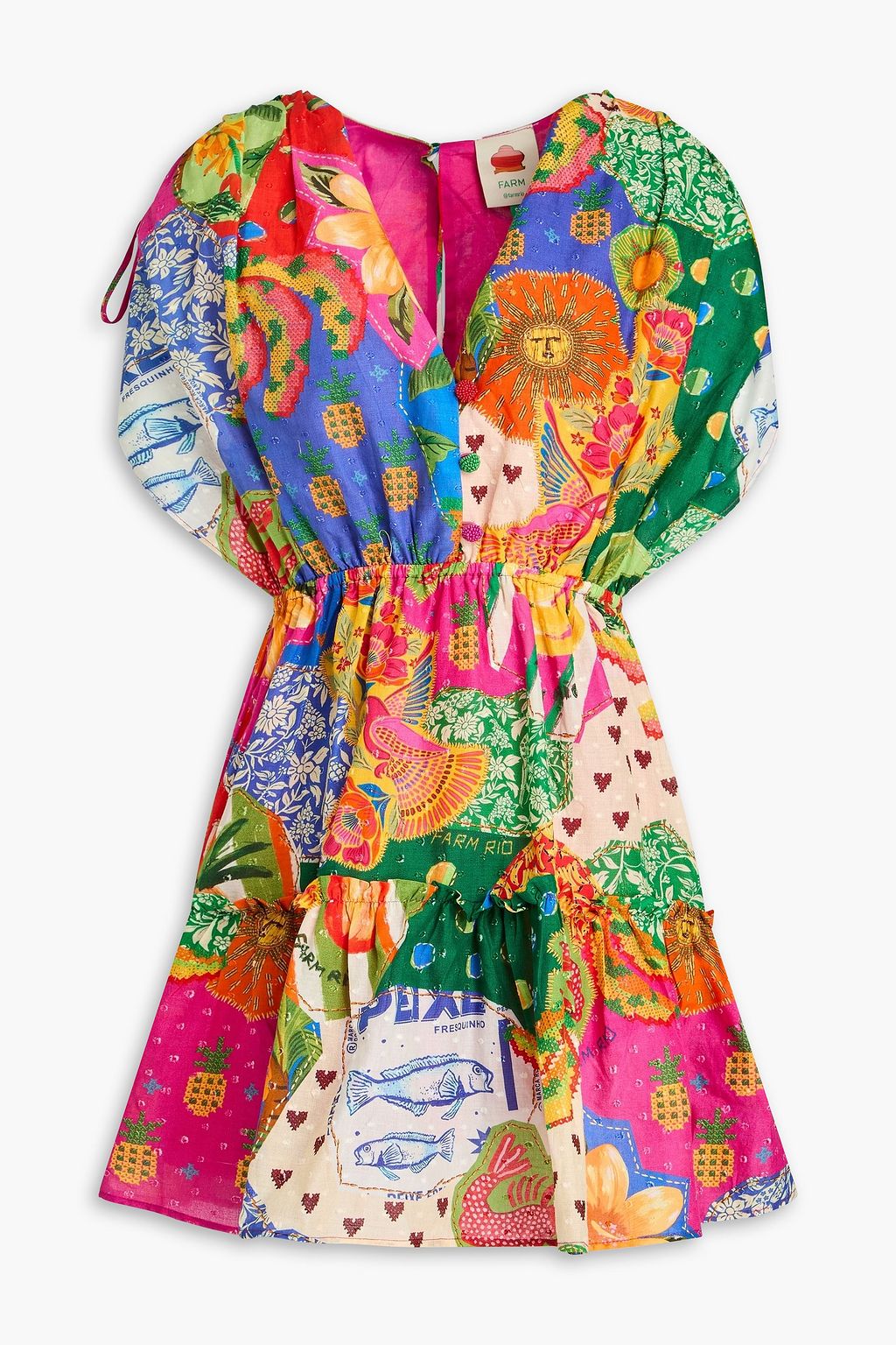 FARM RIO فستان قصير من القطن وقماش فيل كوبيه مزين بطبعات ومزين بالخرز