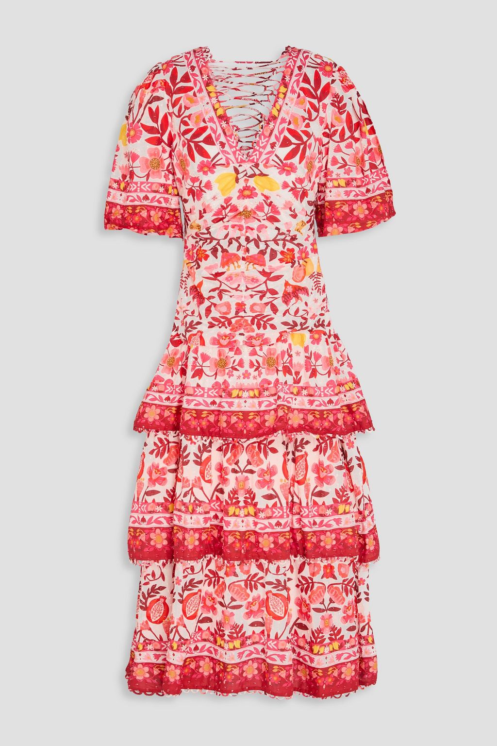 FARM RIO فستان متوسط الطول من القطن بطبقات متدرجة منقط بنمط سويسري بطبعة الأزهار