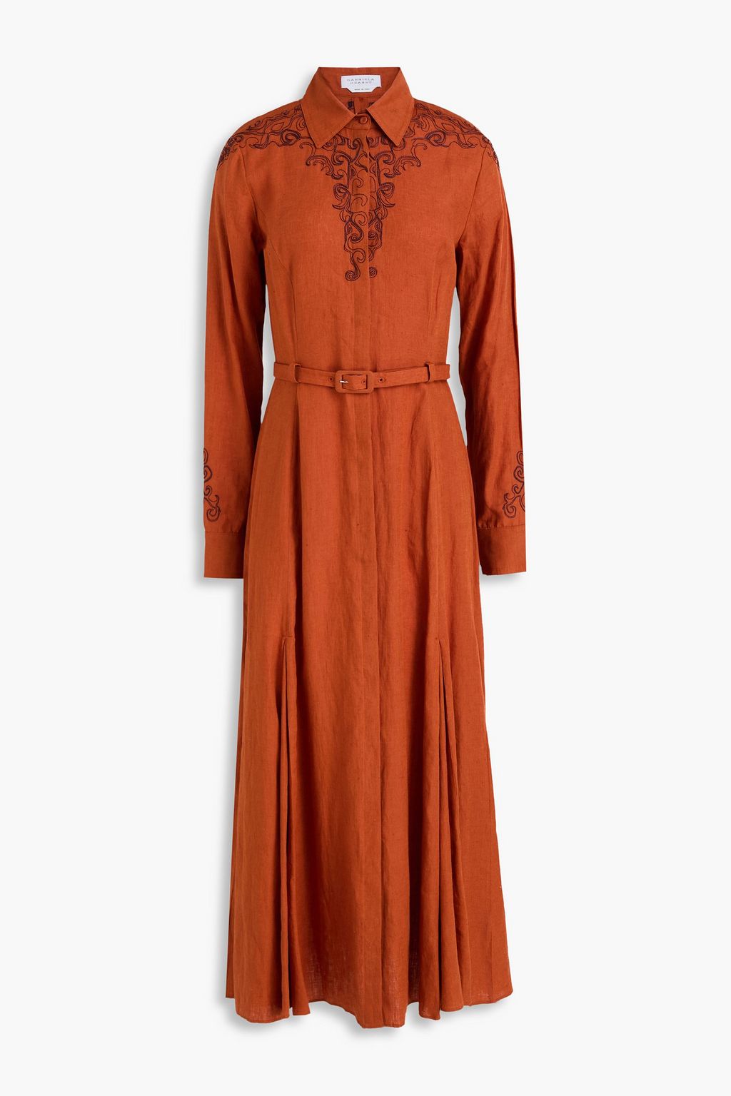 GABRIELA HEARST فستان متوسط الطول "ألوي" على شكل قميص من الكتان بتصميم مطرز ومزين بكسرات