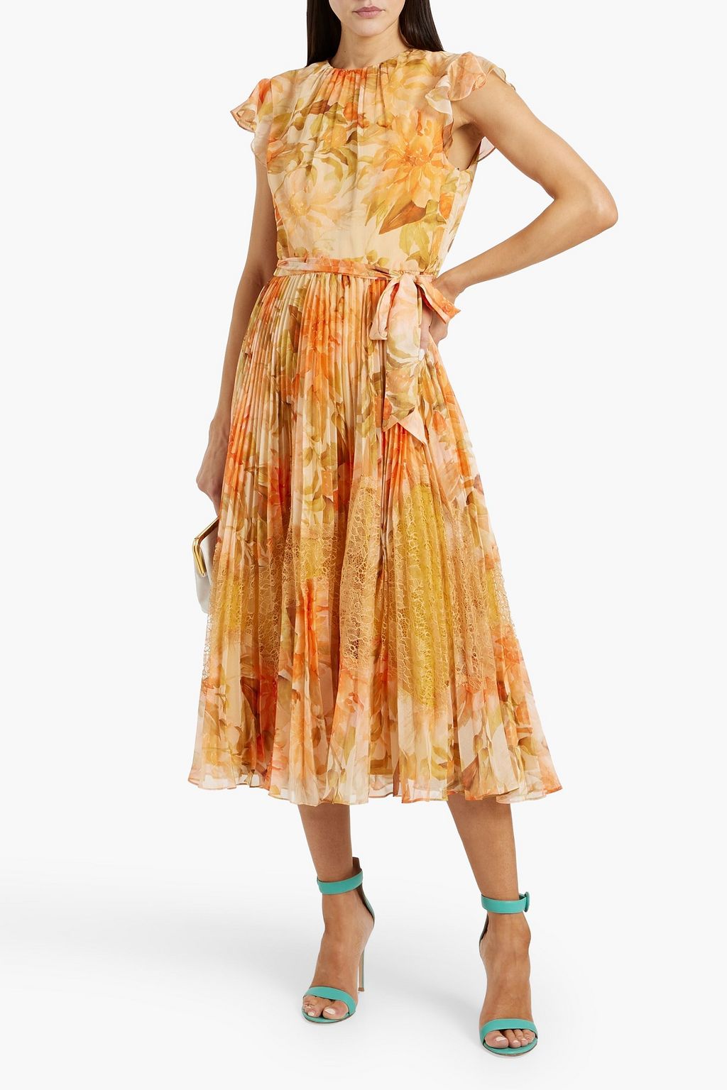 MIKAEL AGHAL فستان متوسط الطول من الجورجيت بطبعة الأزهار مع قطع من الدانتيل المفرّغ محاكة بجانب بعضها البعض
