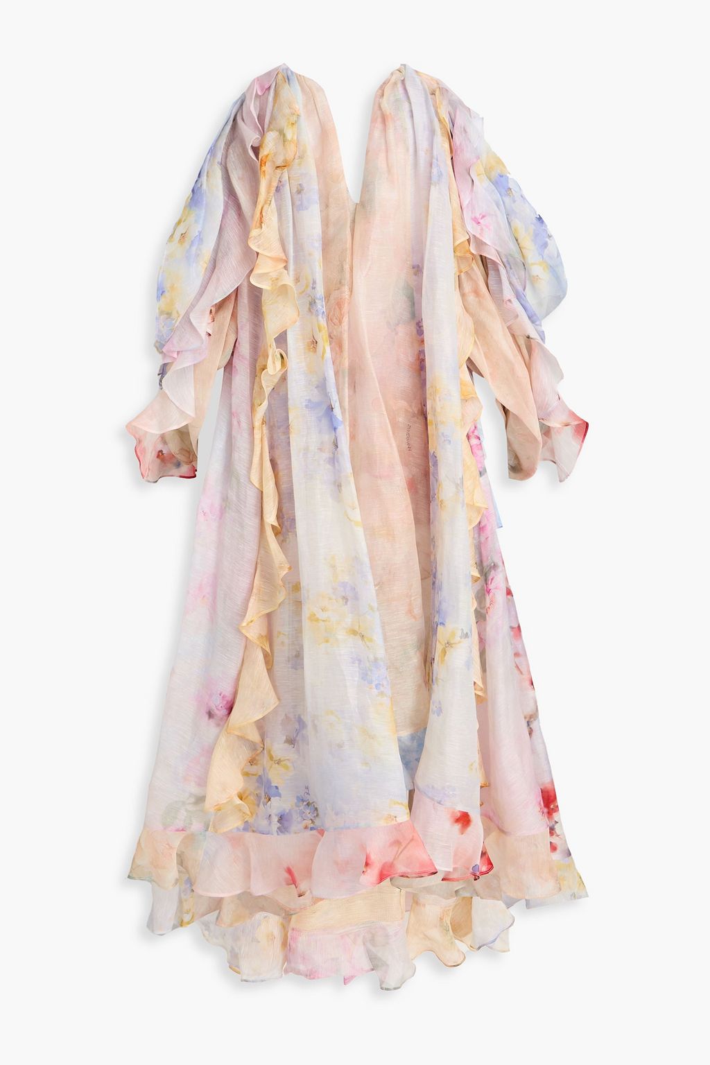 ZIMMERMANN فستان طويل بأكتاف مفتوحة من مزيج الحرير والكتّان مزين بطبعة الأزهار
