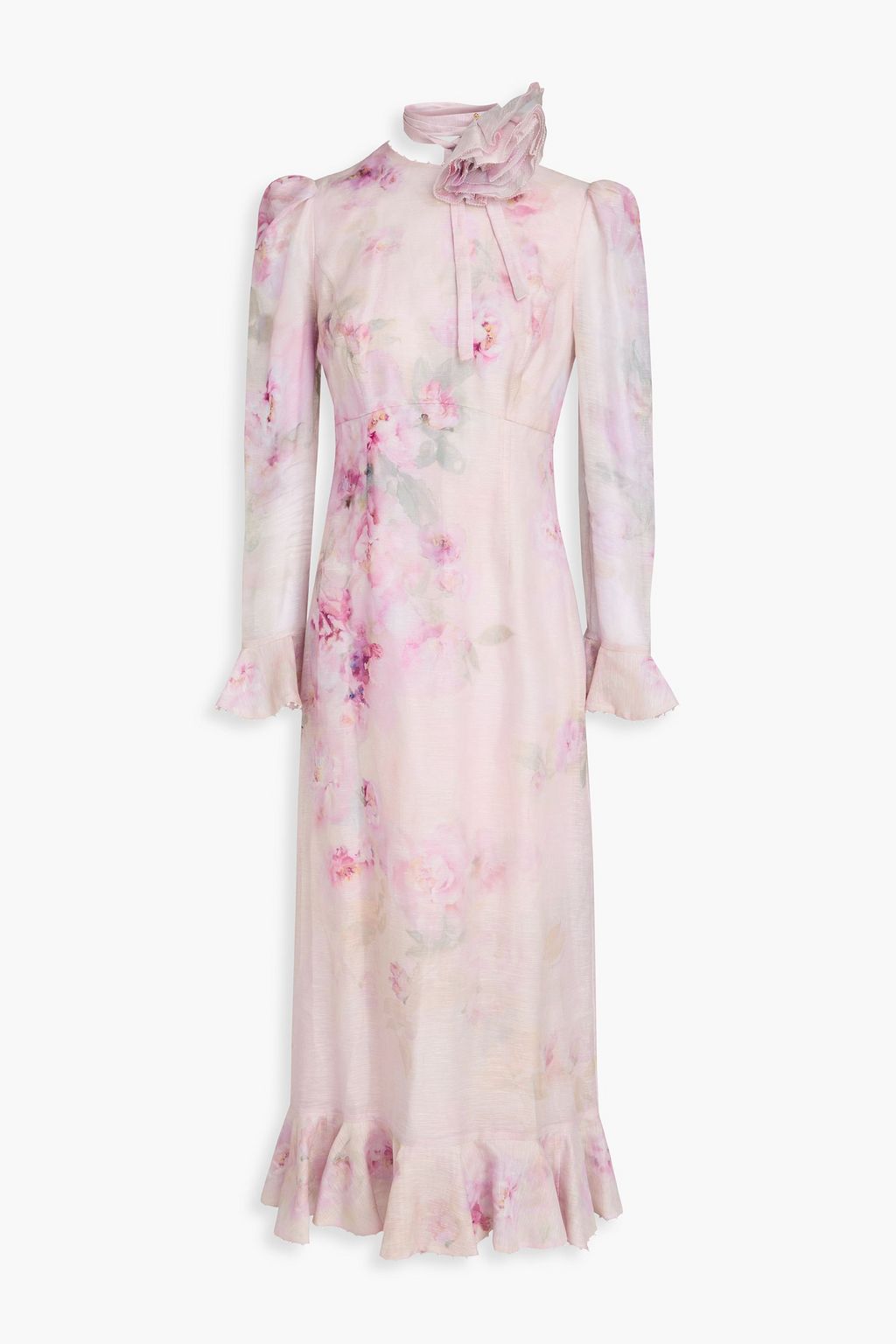 ZIMMERMANN فستان متوسط الطول من مزيج الحرير والكتان بطبعة الأزهار مزين بكشاكش وبربطة بشكل فراشة