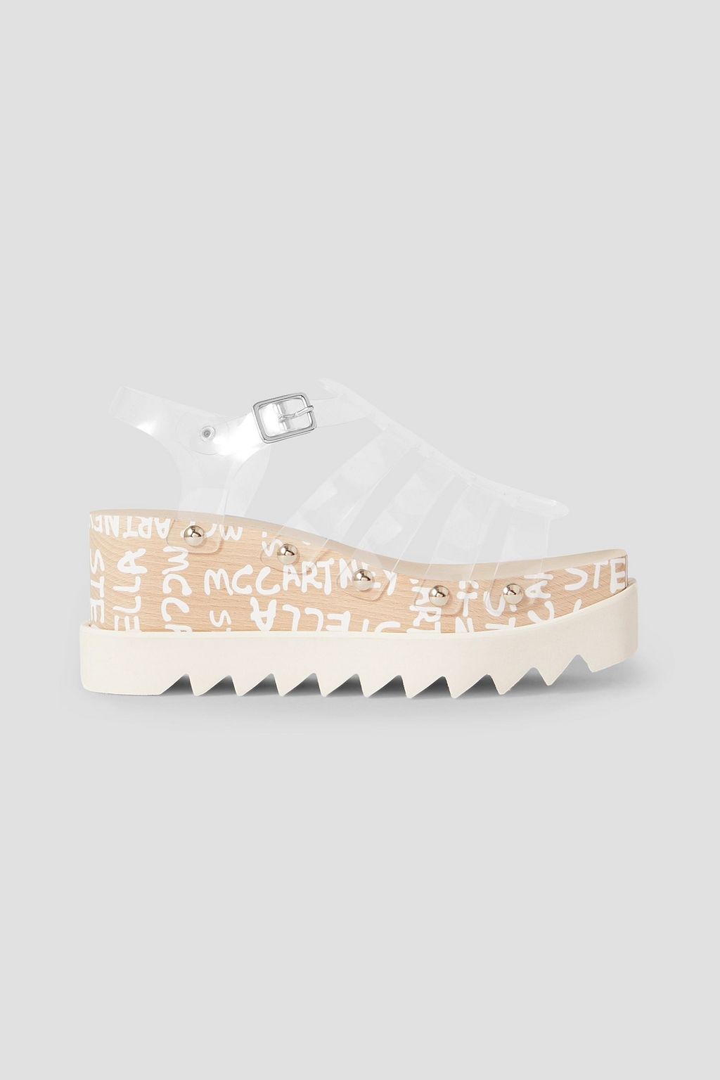 Die „Elyse“ Sandalen von Stella McCartney sind an der Plateausohle aus Holz mit Logos im Graffiti-Stil bedruckt, die der Londoner Künstler Ed Curtis entwarf. Daran befinden sich Riemen aus farblosem PVC und eine geriffelte Gummisohle. Wir tragen das Paar beispielsweise zu Midikleidern oder Jeans.