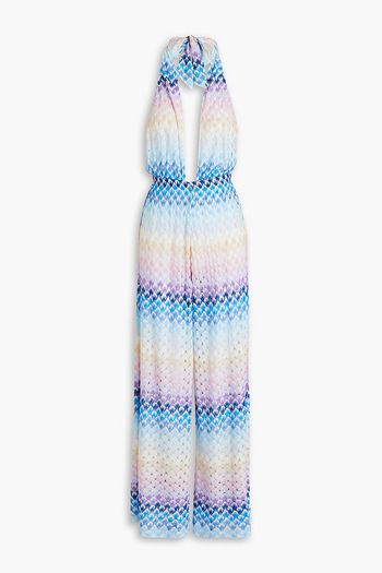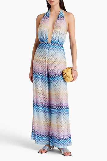 Neckholder-Jumpsuit mit weitem Bein aus Häkelstrick in Metallic-Optik