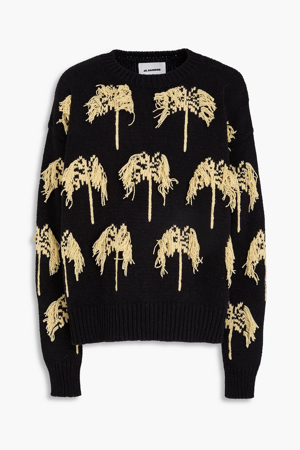 JIL SANDER Strickpullover aus einer Baumwoll-Wollmischung mit Intarsienmuster und Fransen