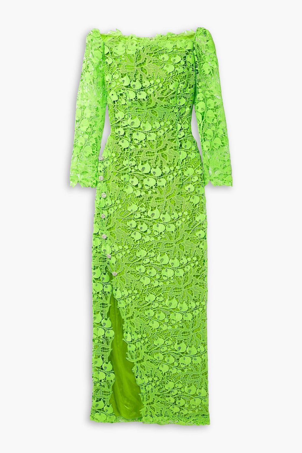 Dieses Midikleid von Monique Lhuillier besteht aus zarter schnurgebundener Spitze, in die ein filigranes Blumenmuster eingearbeitet wurde. Das schmale Modell zeigt sich mit einem hohen Seitenschlitz mit funkelnden kristallverzierten Knöpfen sowie durchscheinenden Ärmeln. Ergänzen Sie das kräftige Limettengrün mit glitzernden Ohrringen und weißen Heels.