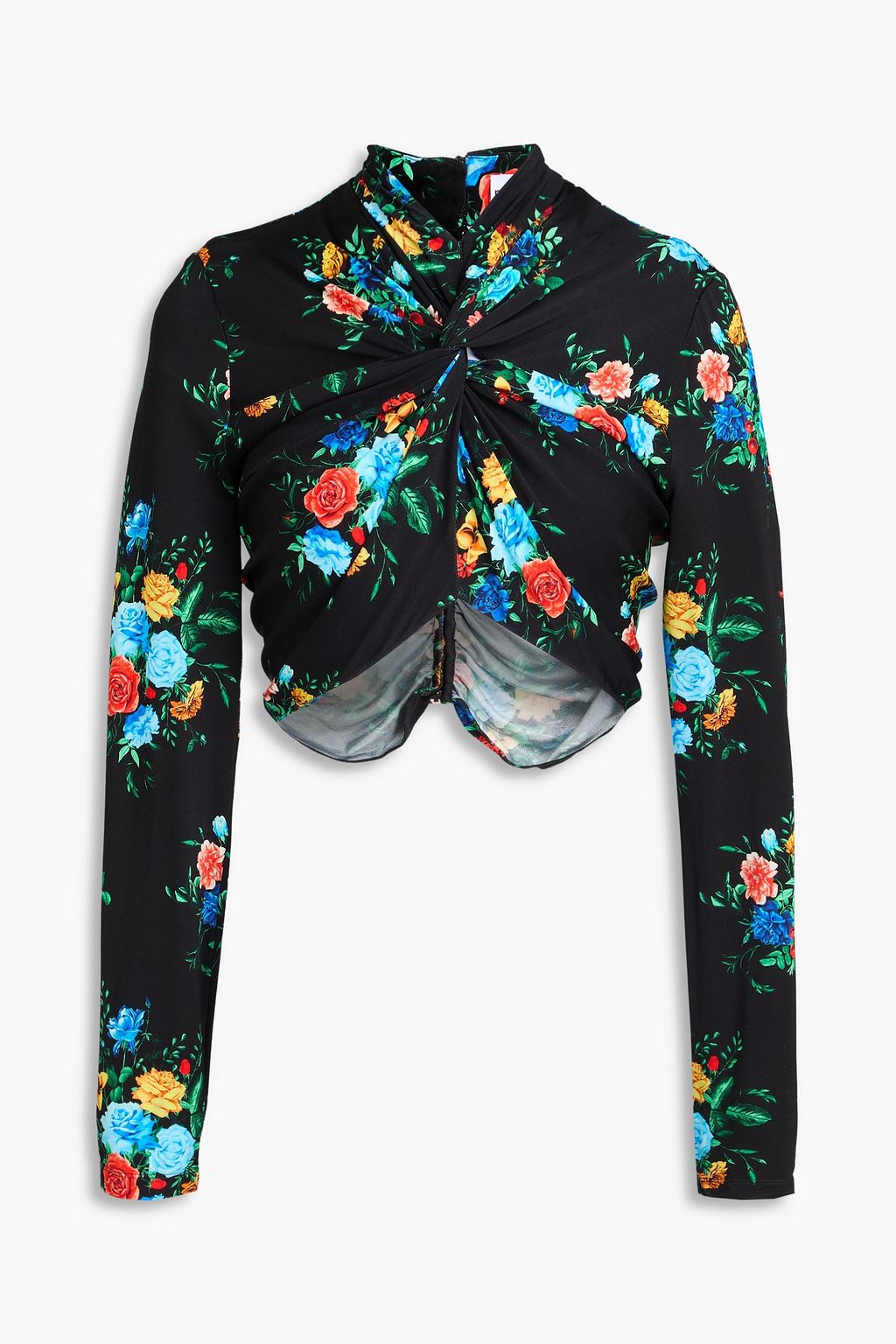 RABANNE Cropped Oberteil aus glänzendem Jersey mit floralem Print und Twist-Detail