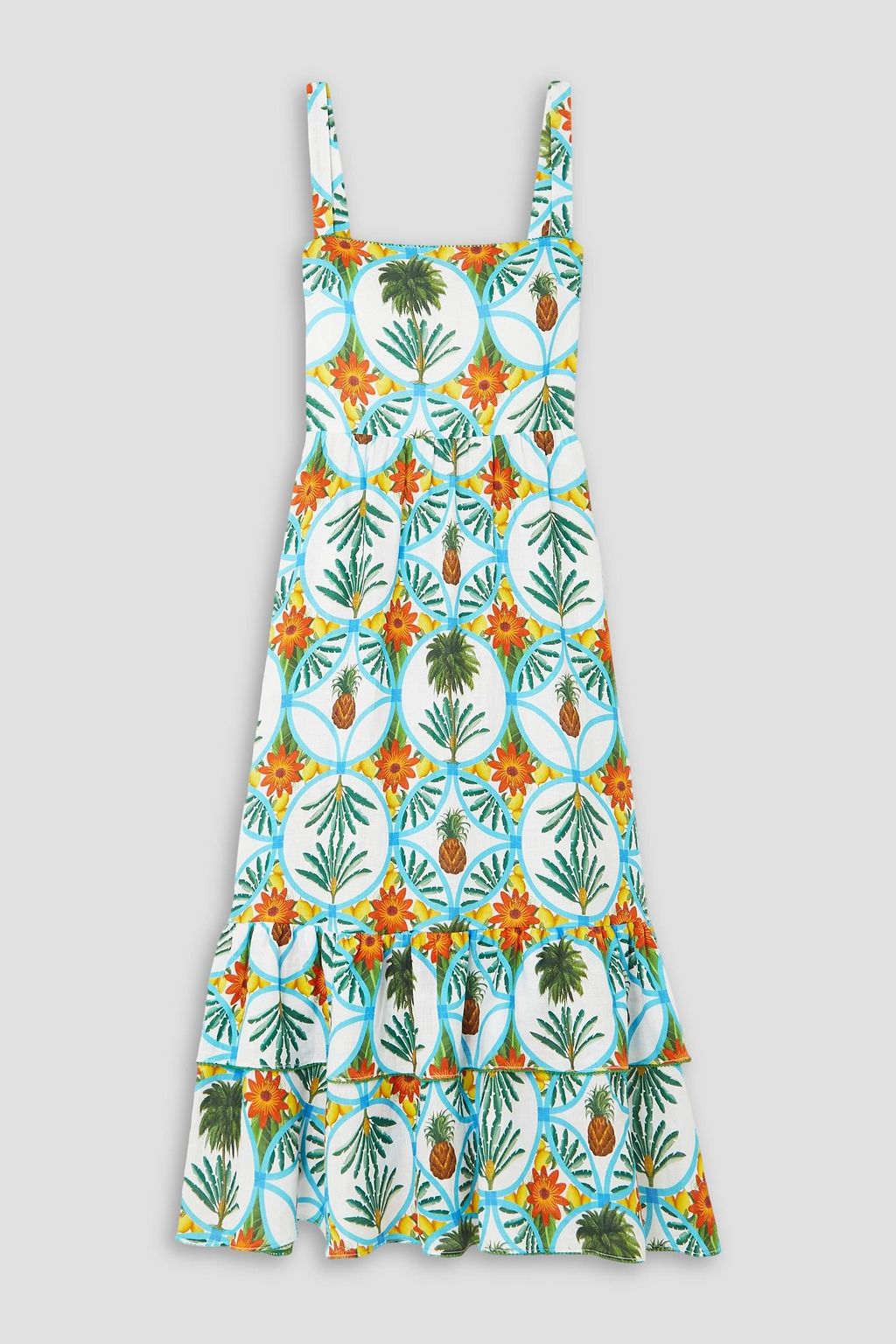 Borgo de Nor's 'Dani' dress is cut from cotton and linen-blend that's playfully printed with retro palm leaves, flowers and pineapples. It fits slim through the bodice before flaring out to a flowy midi skirt traced with ruffles. Style yours with gold accessories for sunset dinners.