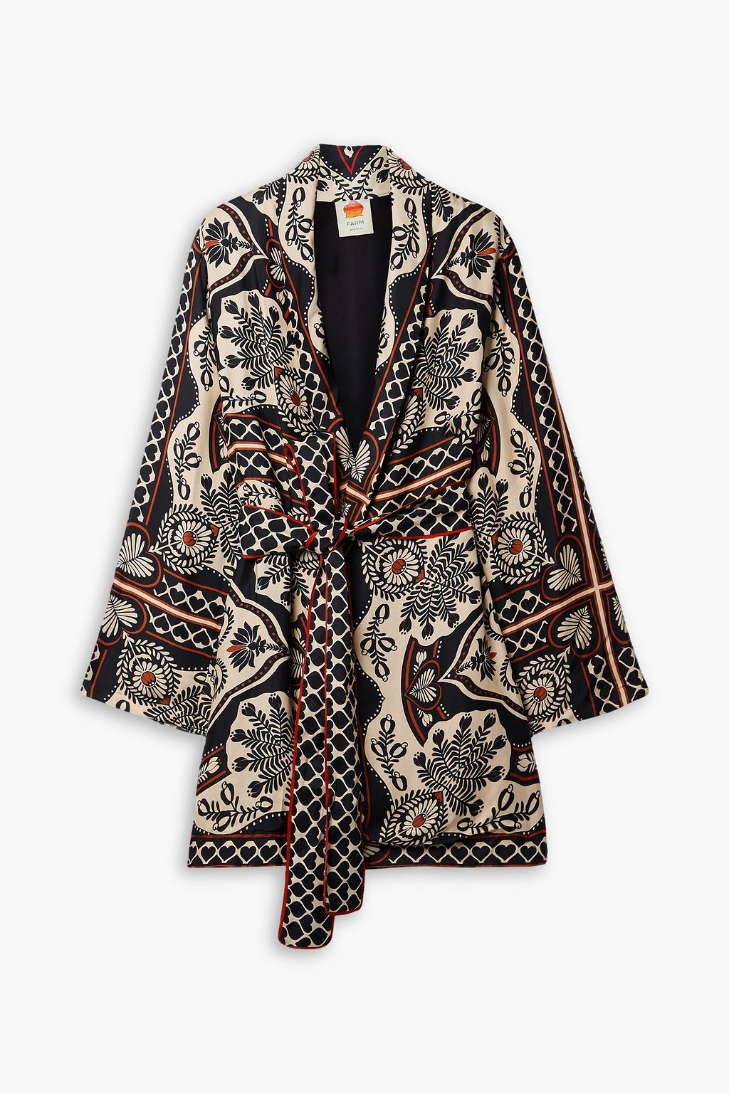 Farm Rio's jacket is printed with a black and cream abstract motif shot through with contrasting red details. Made from smooth satin-twill, it has shawl lapels and wide, airy sleeves. Use the detachable belt to highlight your waist.