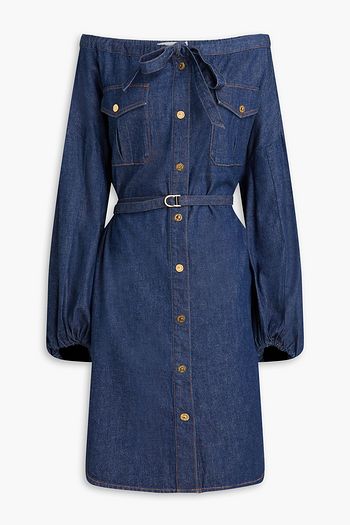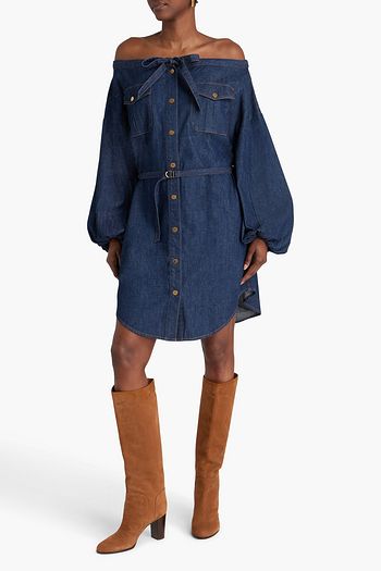 Off-the-shoulder belted denim mini dress