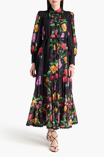 Crochet-trimmed floral-print cotton-blend mini shirt dress