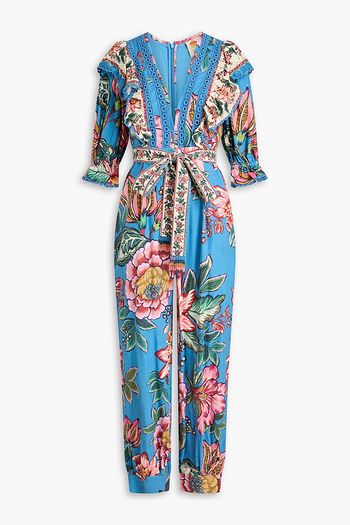 Crochet-trimmed floral-print linen-blend jumpsuit