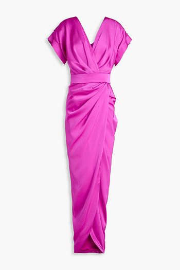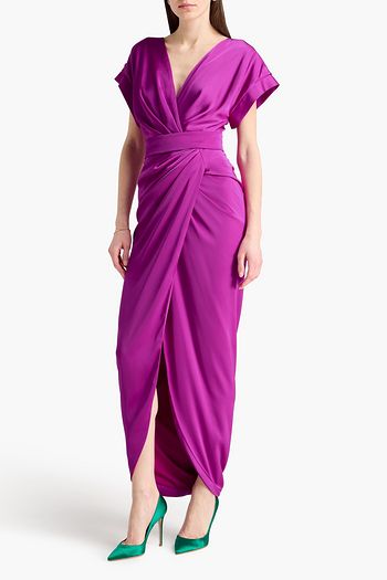 Raven off-the-shoulder draped satin-trimmed crepe gown